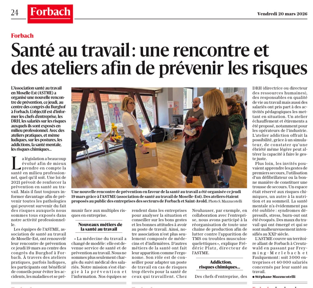 Une rencontre consacrée à la prévention en milieu professionnel s’est tenue aujourd’hui, au centre des congrès du Burghof à Forbach. L’événement a réuni plusieurs acteurs autour des enjeux de santé et de sécurité au travail. Au programme : des échanges, des ateliers pratiques et des temps de partage d’expériences. Cette journée visait à promouvoir de meilleures pratiques et à renforcer la coopération entre professionnels.